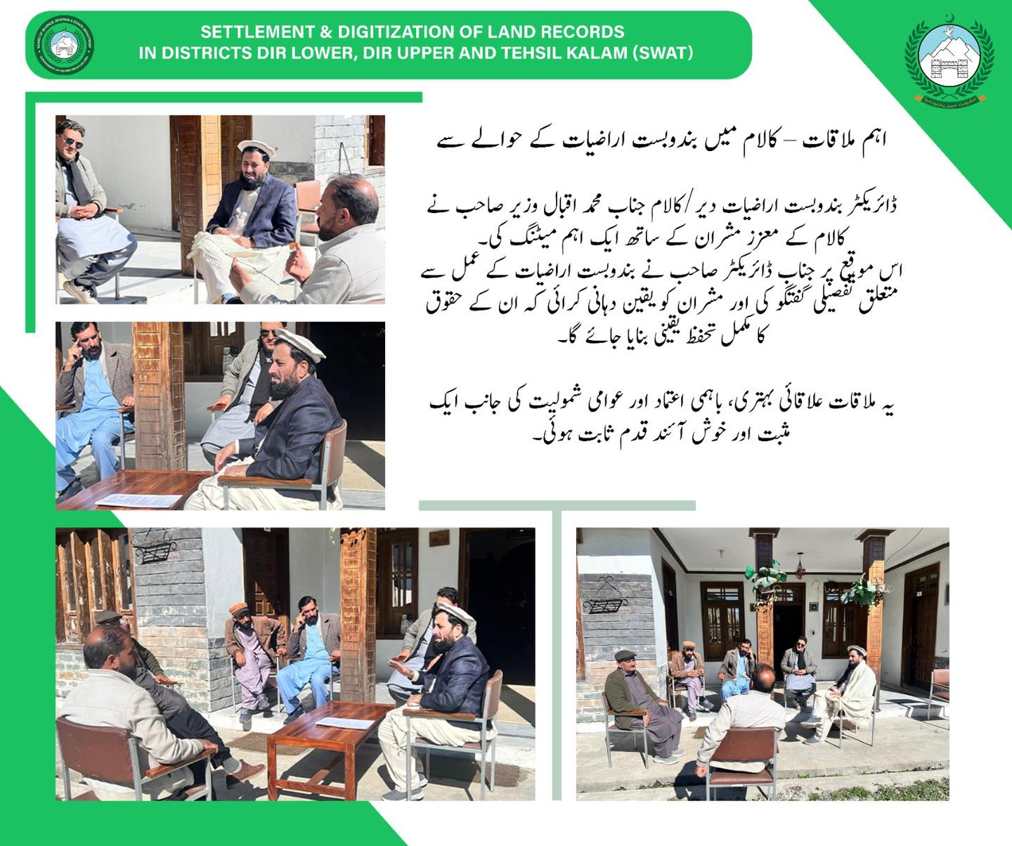 اہم ملاقات – کالام میں بندوبست اراضیات کے حوالے سےڈائریکٹر بندوبست اراضیات دیر/کالام جناب محمد اقبال وزیر صاحب نے کالام کے معزز مشران کے ساتھ ایک اہم میٹنگ کی۔اس موقع پر جناب ڈائریکٹر صاحب نے بندوبست اراضیات کے عمل سے متعلق تفصیلی گفتگو کی اور مشران کو یقین دہانی کرائی کہ ان کے حقوق کا مکمل تحفظ یقینی بنایا جائے گا۔یہ ملاقات علاقائی بہتری، باہمی اعتماد اور عوامی شمولیت کی جانب ایک مثبت اور خوش آئند قدم ثابت ہوئی۔